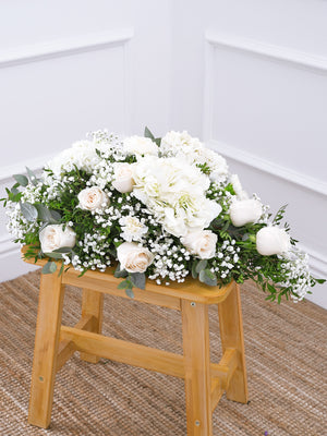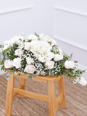The Pure Bliss Spray is a graceful and elegant display of flowers, carefully crafted to convey comfort, purity, and sympathy. It features a harmonious blend of white roses, white carnations, white hydrangeas, gypsophila, as well as accents of pistach and eucalyptus foliage.