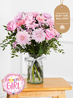 A charming mix of pink chrysanthemums, gerberas, carnations, and roses, accented with statice and fresh pistach greenery. Presented with a complimentary baby girl balloon, it’s a thoughtful way to celebrate the joy of a new arrival.