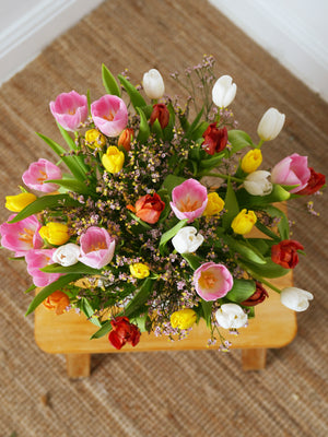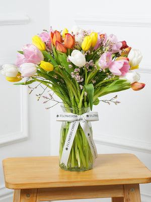 Medley Signature Tulips - Vase features a vibrant mix of pink, yellow, white, and orange tulips paired with airy gypsophila, capturing the cheerful spirit of spring. Bright, fresh, and full of life, it’s the perfect way to celebrate new beginnings and bring seasonal joy into any space.