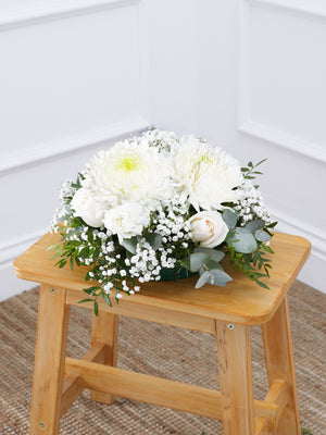 The Simply White Posy is a serene and elegant arrangement that emanates a sense of tranquility and purity. It showcases pristine white roses, white carnations, white chrysanthemums, gypsophilia, complemented by pistachio and eucalyptus foliage.