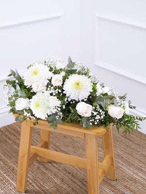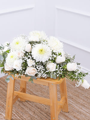 The Simply White Spray is a graceful and elegant display of flowers, carefully crafted to convey comfort, purity, and sympathy. It features a harmonious blend of white roses, white carnations, white chrysanthemums, gypsophila, as well as accents of pistach and eucalyptus foliage.