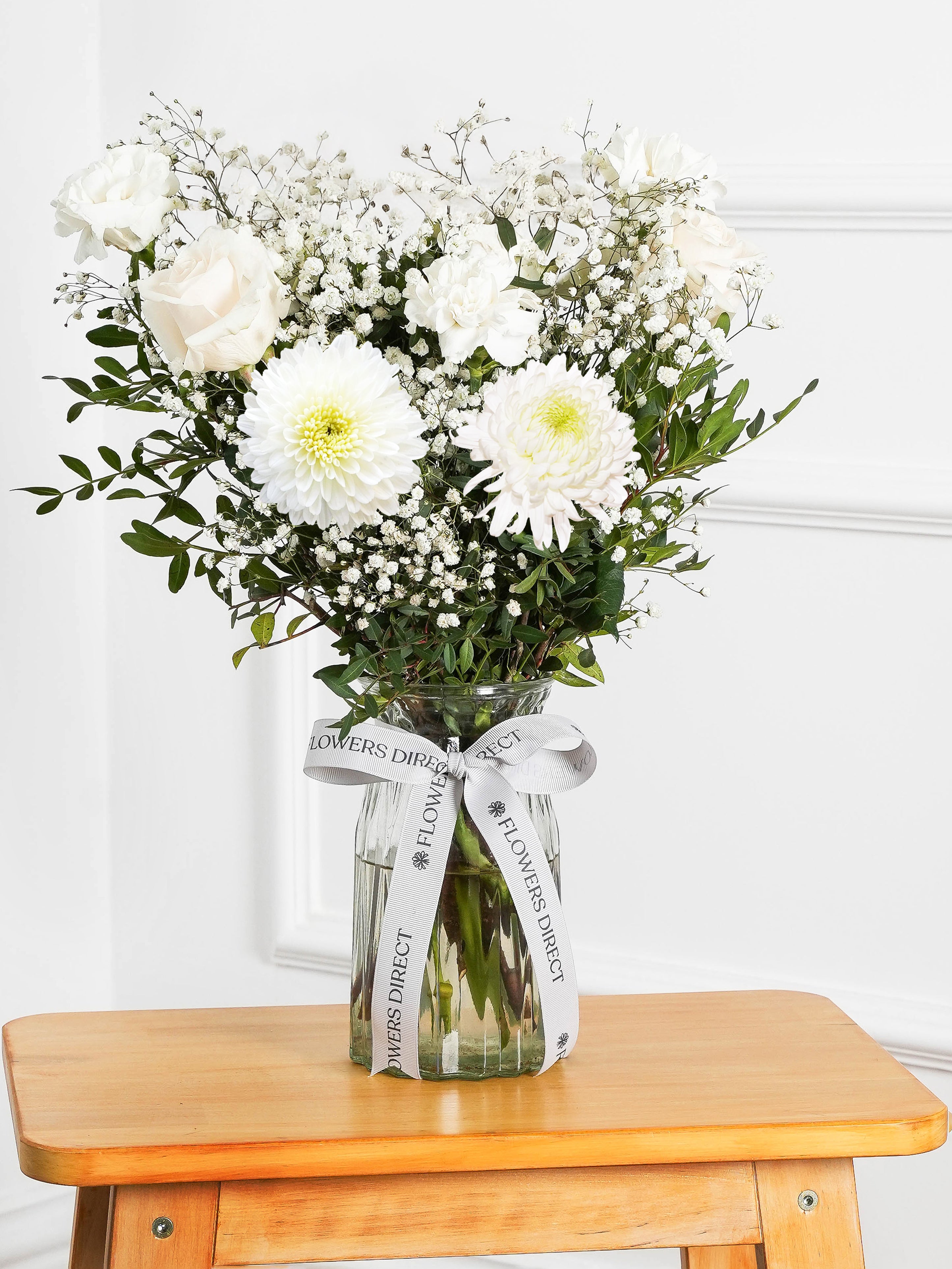 An all-white vase arrangement of roses, carnations, chrysanthemums, and gypsophilia, complemented by pistach greenery and eucalyptus. A beautiful and affordable gift to suit any occasion.