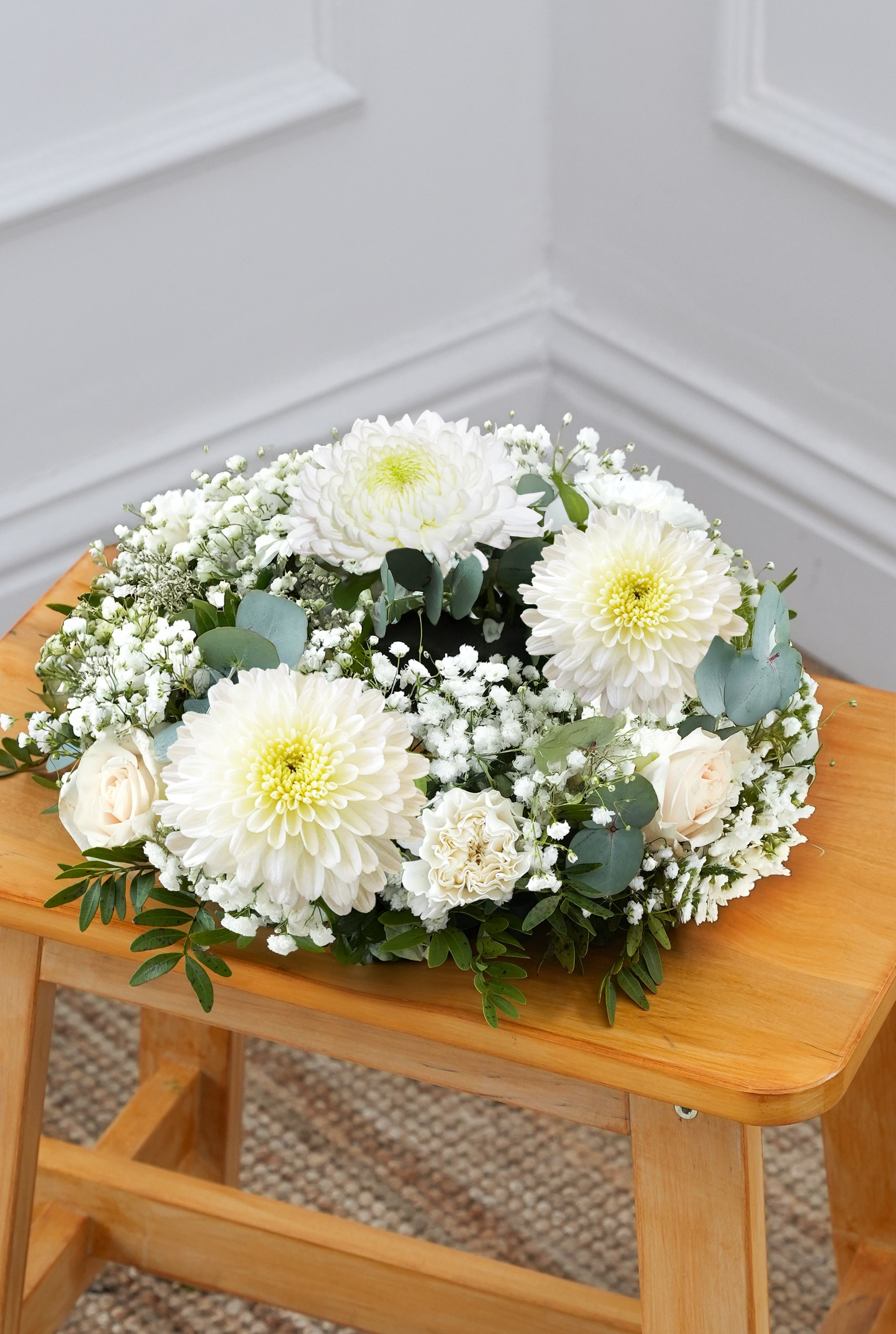 This enchanting funeral wreath, embellished with pristine white chrysanthemums, roses, carnations, gypsophila, and accented with pistach foliage and fragrant Eucalyptus, exudes a sense of tranquil beauty. Each flower carefully creating a heartfelt sympathy gift.
