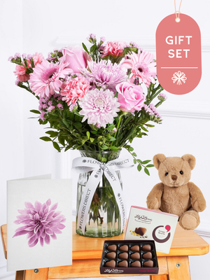 A pretty mix of pink roses, gerberas, and pink chrysanthemums, accented with pink statice, pistach greenery, and eucalyptus. Beautifully arranged in a vase, it’s an elegant and romantic gift for any occasion.