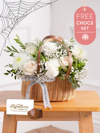 Simply White: A hauntingly elegant basket of white roses, carnations, chrysanthemums, and gypsophilia with eucalyptus accents — ideal for a refined Halloween aesthetic.
