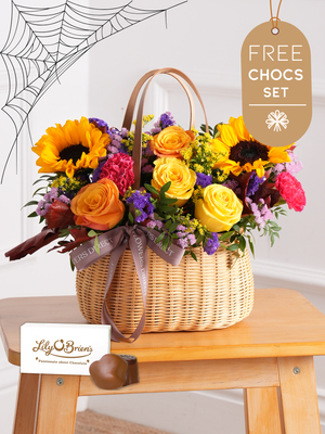 Bring spooky-season charm with our Halloween Basket. Featuring orange and yellow roses, cerise carnations, sunflowers, solidago, pistach, and oak leaves, it’s a vibrant and festive gift for Halloween celebrations.