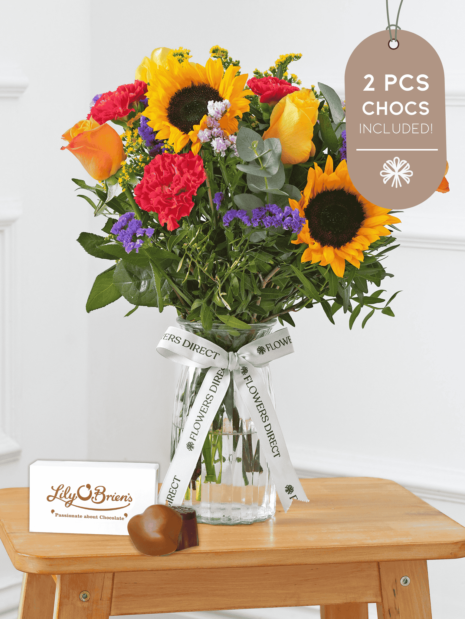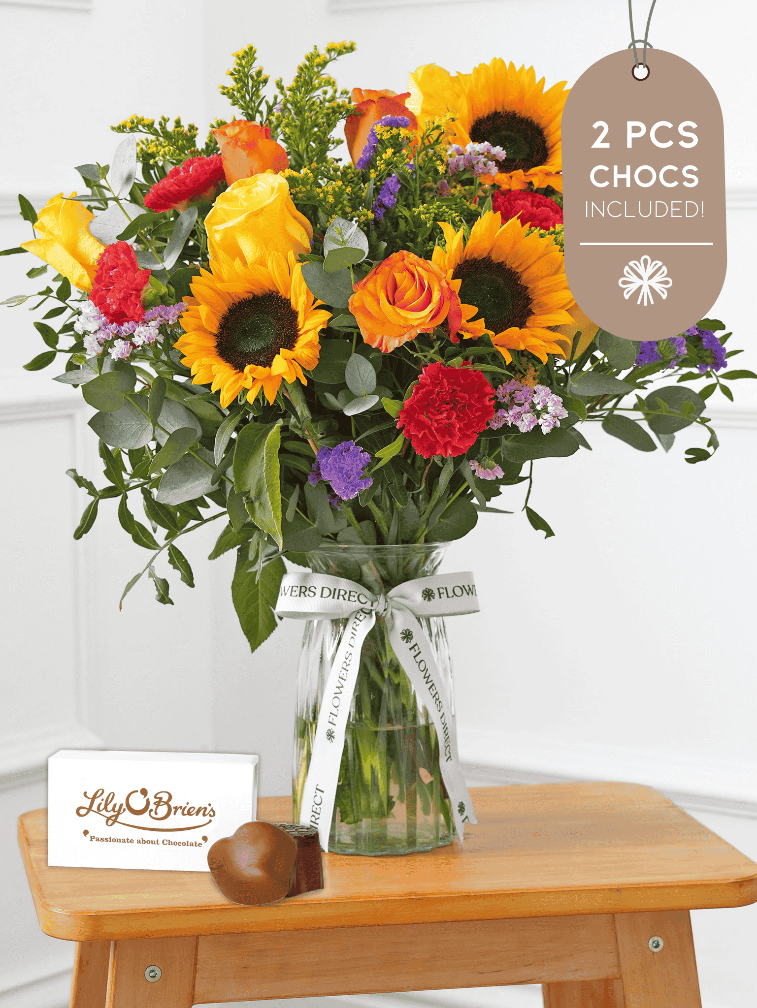 This arrangement comes with a complimentary 2-piece chocolate set.