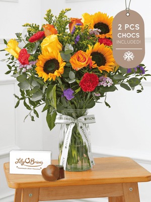 Brighten up any room with our "Colour Burst" arrangement, featuring stunning sunflowers, cerise carnations, blue and pink statice, and vibrant yellow and orange roses. This cheerful arrangement is sure to bring joy and happiness to any occasion.