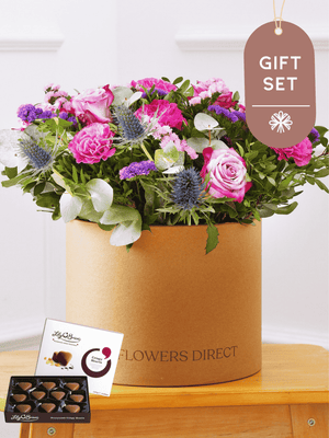 Elevate Mother's Day gifting with our enchanting Purple Majesty arrangement, nestled in a chic hatbox. Featuring a captivating blend of purple large-headed roses, delicate purple carnations, and accents of blue and pink statice, this exquisite bouquet is expertly curated with pistach and eucalyptus leaves, creating a regal floral masterpiece that reflects both sophistication and admiration.