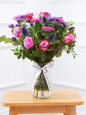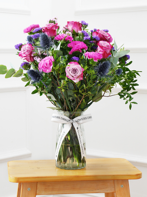 Elevate Mother's Day gifting with our Purple Majesty arrangement, a regal display of love and appreciation. This exquisite bouquet features a harmonious blend of purple large-headed roses, captivating purple carnations, vibrant blue and pink statice, and lush pistach and eucalyptus leaves, all thoughtfully arranged in a stylish vase, creating a majestic and heartfelt tribute to the extraordinary mothers in your life.