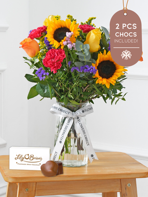 Brighten up any room with our "Colour Burst" arrangement, featuring stunning sunflowers, cerise carnations, blue and pink statice, and vibrant yellow and orange roses. This cheerful arrangement is sure to bring joy and happiness to any occasion.