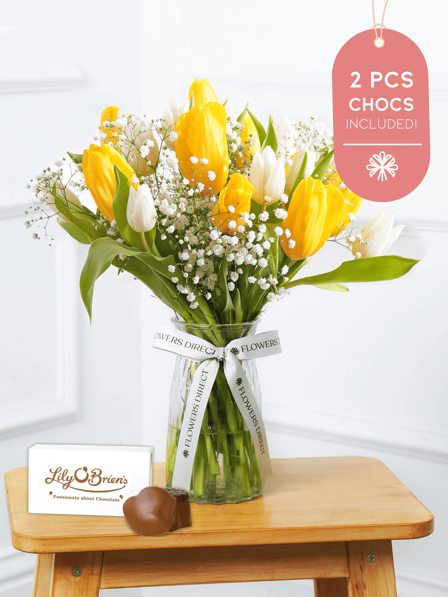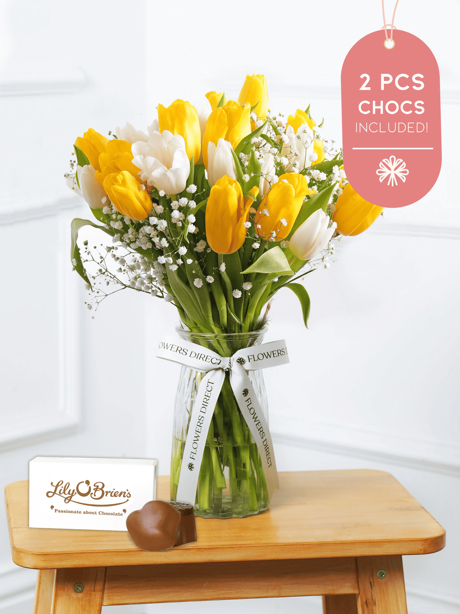 White & Yellow Tulips - Vase, adorned with white and yellow tulips complemented by gypsophila, epitomises the essence of spring with its radiant hues and fresh blooms, making it a perfect gift to herald the season of new beginnings and joy.