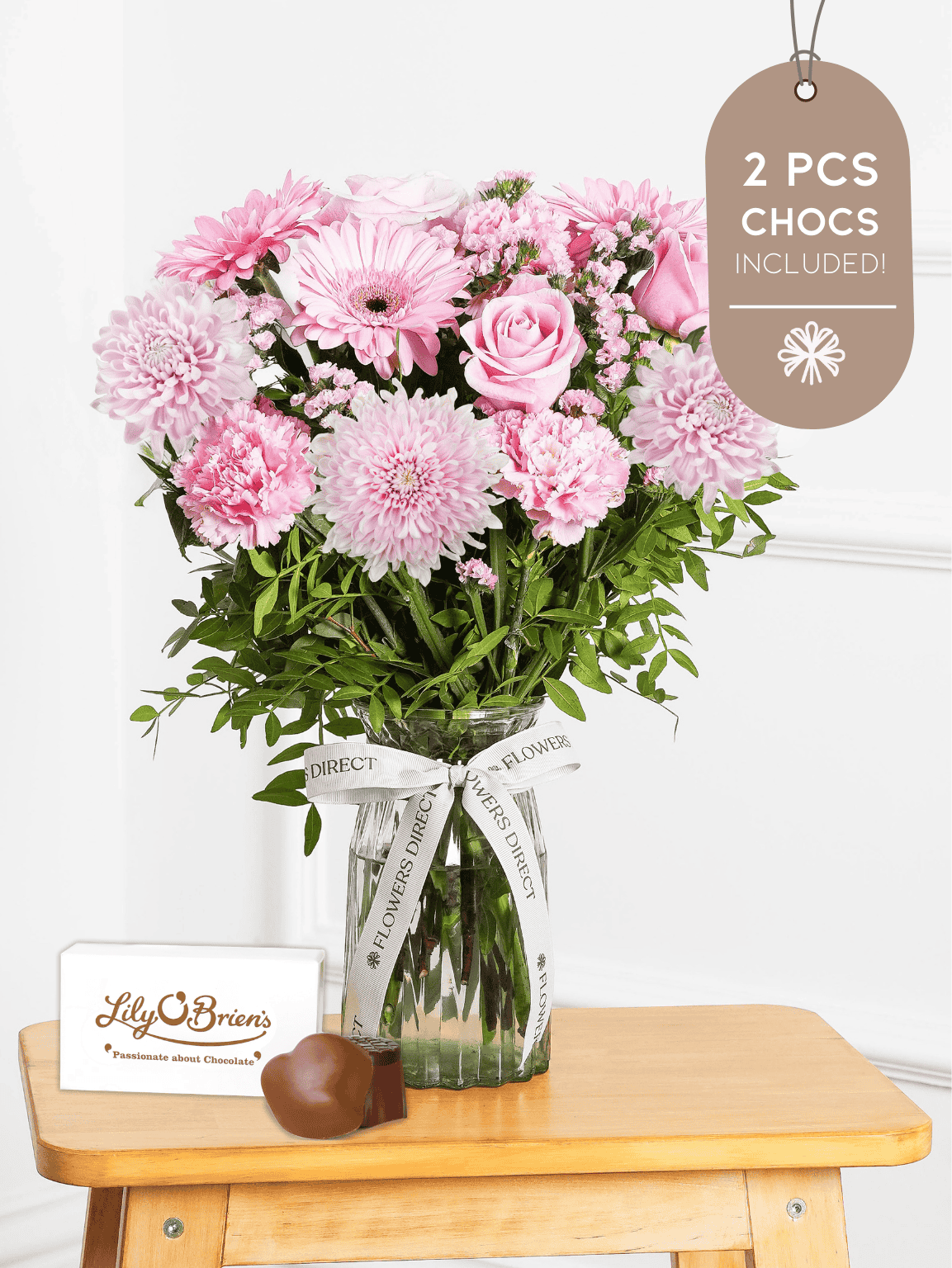 A pretty mix of pink roses, gerberas, and pink chrysanthemums, accented with pink statice, pistach greenery, and eucalyptus. Beautifully arranged in a vase, it’s an elegant and romantic gift for any occasion.