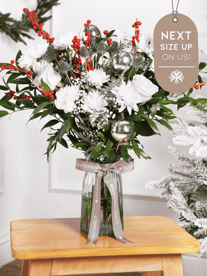 A stunning arrangement of white roses, carnations, Ilex, gypsophilia, chrysanthemums, blue thistle, silver asparagus fern, silver baubles, and ruskus leaves, elegantly displayed in a vase. An affordable way to spread Christmas joy and warmth to loved ones.