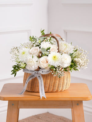 Filled with white roses, carnations, chrysanthemums, and gypsophilia, accented by pistach greenery and eucalyptus. A simple and affordable basket that makes a thoughtful gift for any occasion.