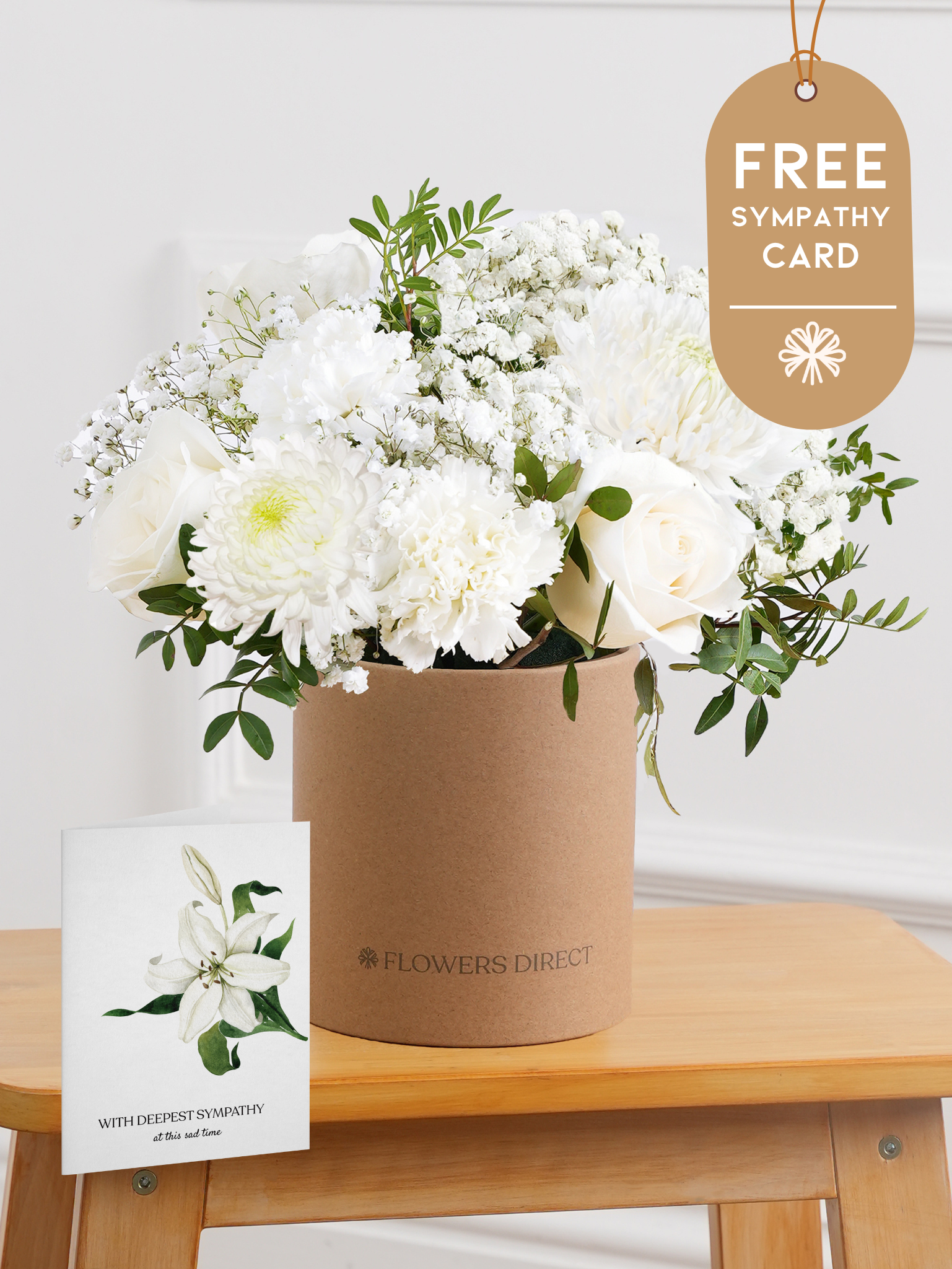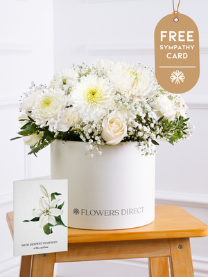 An all-white hatbox of roses, carnations, chrysanthemums, and gypsophilia with pistach greenery and eucalyptus. A simple, elegant tribute to express sympathy and peace.