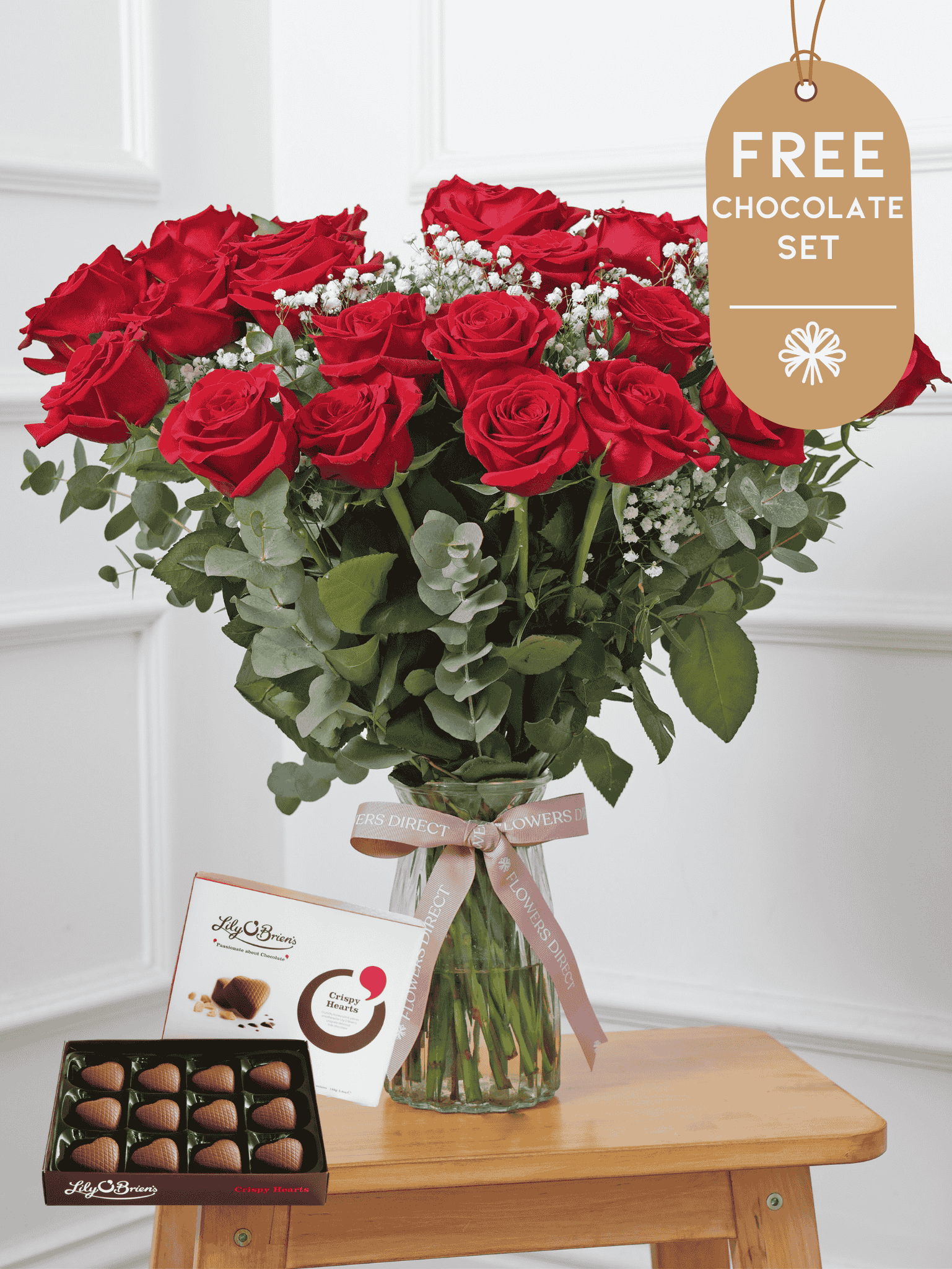 This arrangement comes with a free Crispy Hearts Chocolates.